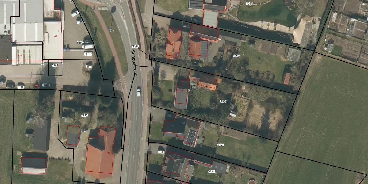 Het perceel waarop Schoolstraat 69-A staat heeft een oppervlakte van 2025 m². Dit is een zeer groot perceel. De perceeloppervlakte wordt geregistreerd door het Kadaster. Gedetailleerde informatie over de maten van dit perceel kunt u vinden in het rapport Kadastrale kaart met maatvoering van Schoolstraat 69-A.