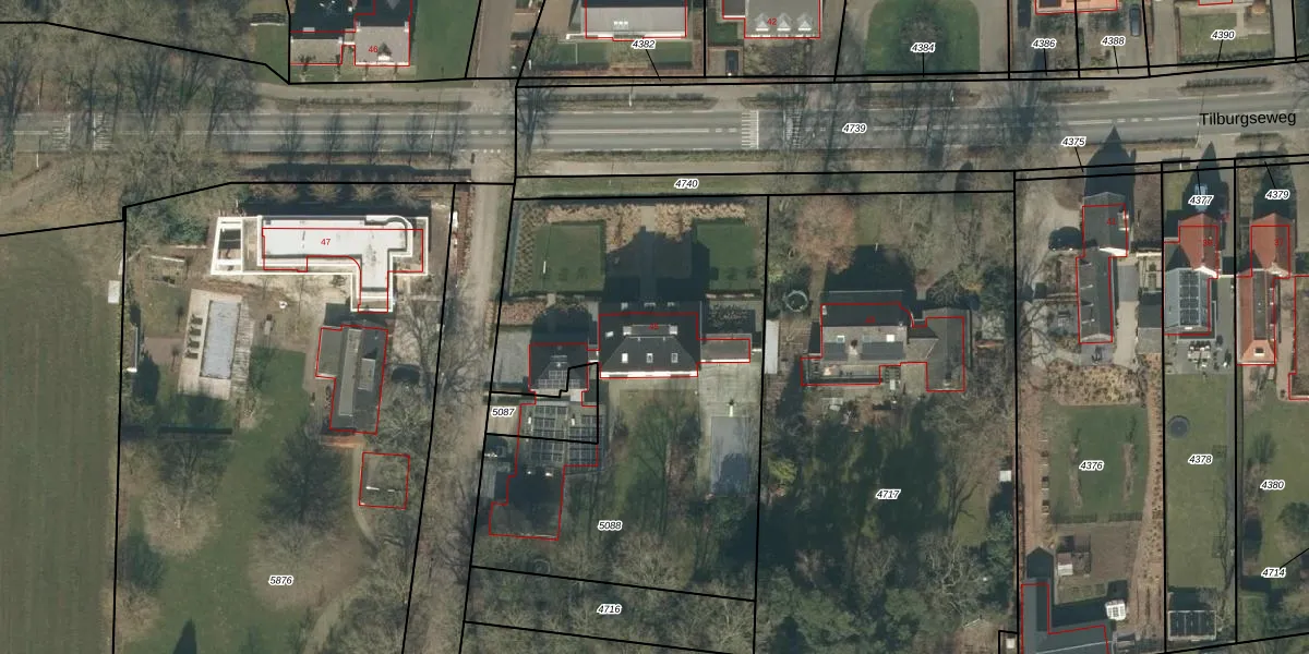 Het perceel waarop Tilburgseweg 45 staat heeft een oppervlakte van 2325 m². Dit is een zeer groot perceel. De perceeloppervlakte wordt geregistreerd door het Kadaster. Gedetailleerde informatie over de maten van dit perceel kunt u vinden in het rapport Kadastrale kaart met maatvoering van Tilburgseweg 45.