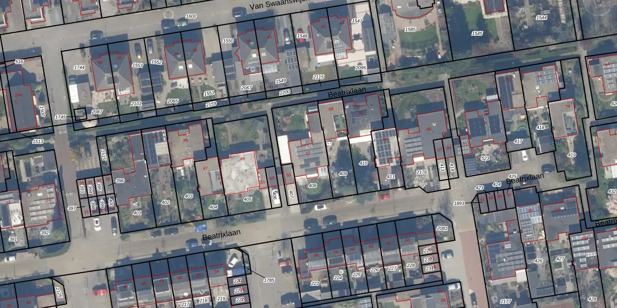 Het perceel waarop Beatrixlaan 57 staat heeft een oppervlakte van 441 m². Dit is een groot perceel. De perceeloppervlakte wordt geregistreerd door het Kadaster. Gedetailleerde informatie over de maten van dit perceel kunt u vinden in het rapport Kadastrale kaart met maatvoering van Beatrixlaan 57.
