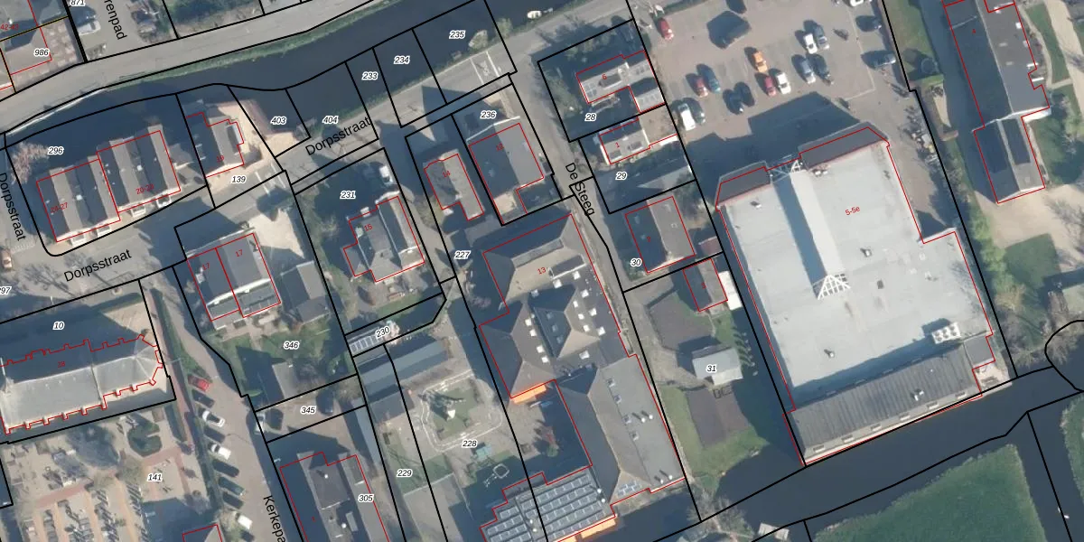 Het perceel waarop Dorpsstraat 13 staat heeft een oppervlakte van 2021 m². Dit is een zeer groot perceel. De perceeloppervlakte wordt geregistreerd door het Kadaster. Gedetailleerde informatie over de maten van dit perceel kunt u vinden in het rapport Kadastrale kaart met maatvoering van Dorpsstraat 13.