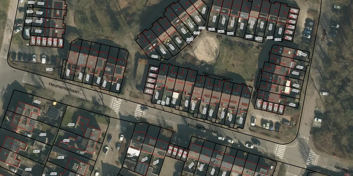 Heumensebaan 65 is gelegen op kadastraal perceel MOO00A5004. Deze kadastrale aanduiding is uniek en wordt gebruikt door het Kadaster om eigendomsrechten en andere zakelijke rechten vast te leggen. Het perceel maakt onderdeel uit van de kadastrale gemeente Mook en Middelaar.