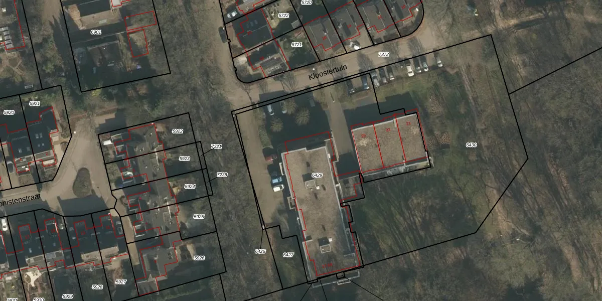 Het perceel waarop Kloostertuin 33 staat heeft een oppervlakte van 2440 m². Dit is een zeer groot perceel. De perceeloppervlakte wordt geregistreerd door het Kadaster. Gedetailleerde informatie over de maten van dit perceel kunt u vinden in het rapport Kadastrale kaart met maatvoering van Kloostertuin 33.