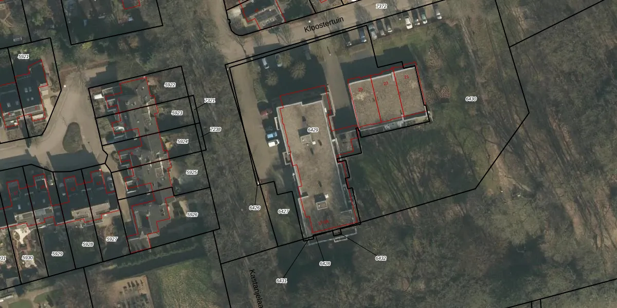 Het perceel waarop Kloostertuin 43 staat heeft een oppervlakte van 2440 m². Dit is een zeer groot perceel. De perceeloppervlakte wordt geregistreerd door het Kadaster. Gedetailleerde informatie over de maten van dit perceel kunt u vinden in het rapport Kadastrale kaart met maatvoering van Kloostertuin 43.