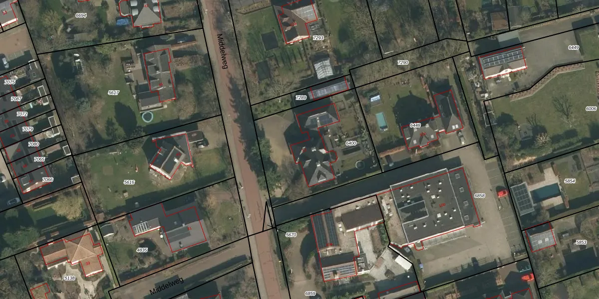 Het perceel waarop Middelweg 12 staat heeft een oppervlakte van 1100 m². Dit is een zeer groot perceel. De perceeloppervlakte wordt geregistreerd door het Kadaster. Gedetailleerde informatie over de maten van dit perceel kunt u vinden in het rapport Kadastrale kaart met maatvoering van Middelweg 12.