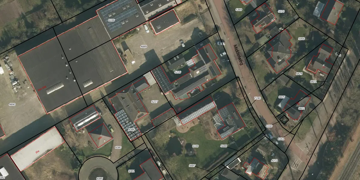 Middelweg 5-B is gelegen op kadastraal perceel MOO00A5226. Deze kadastrale aanduiding is uniek en wordt gebruikt door het Kadaster om eigendomsrechten en andere zakelijke rechten vast te leggen. Het perceel maakt onderdeel uit van de kadastrale gemeente Mook en Middelaar.