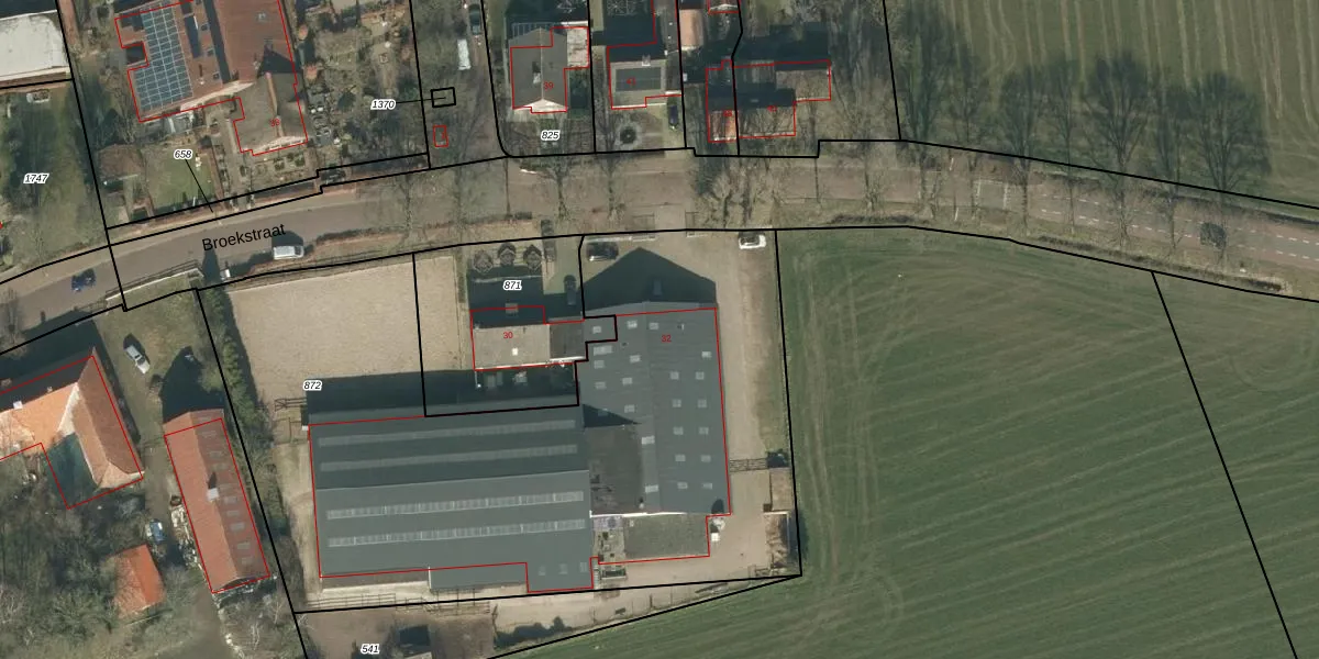 Het perceel waarop Broekstraat 32 staat heeft een oppervlakte van 3748 m². Dit is een zeer groot perceel. De perceeloppervlakte wordt geregistreerd door het Kadaster. Gedetailleerde informatie over de maten van dit perceel kunt u vinden in het rapport Kadastrale kaart met maatvoering van Broekstraat 32.