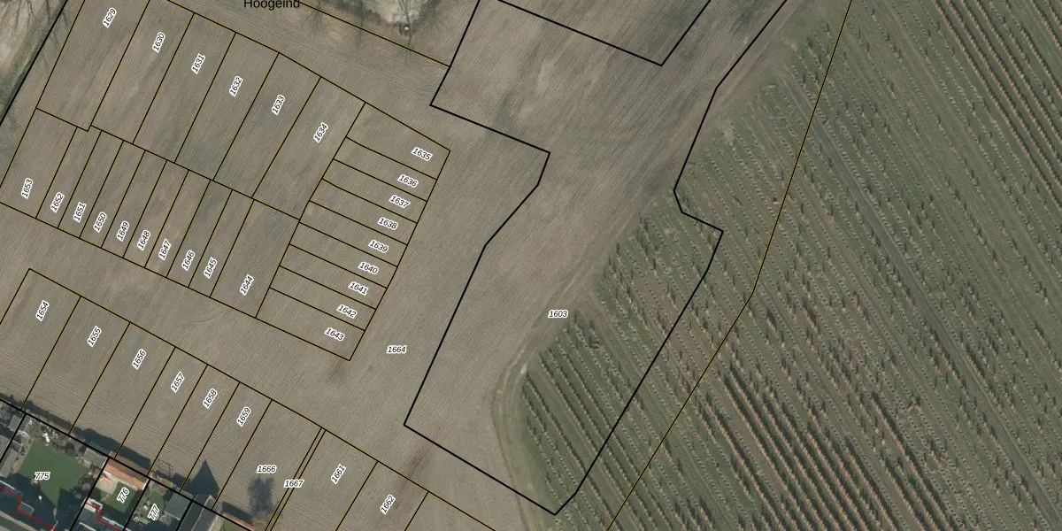Het perceel waarop Hoogeind 22 staat heeft een oppervlakte van 3587 m². Dit is een zeer groot perceel. De perceeloppervlakte wordt geregistreerd door het Kadaster. Gedetailleerde informatie over de maten van dit perceel kunt u vinden in het rapport Kadastrale kaart met maatvoering van Hoogeind 22.