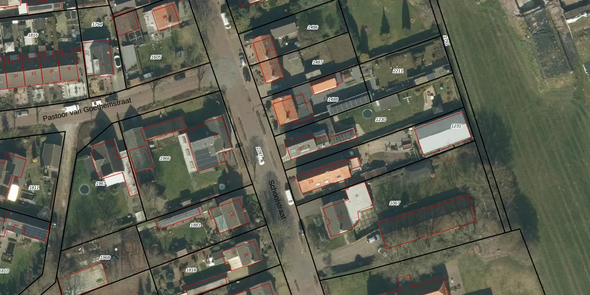 Het perceel waarop Schoolstraat 21 staat heeft een oppervlakte van 800 m². Dit is een groot perceel. De perceeloppervlakte wordt geregistreerd door het Kadaster. Gedetailleerde informatie over de maten van dit perceel kunt u vinden in het rapport Kadastrale kaart met maatvoering van Schoolstraat 21.