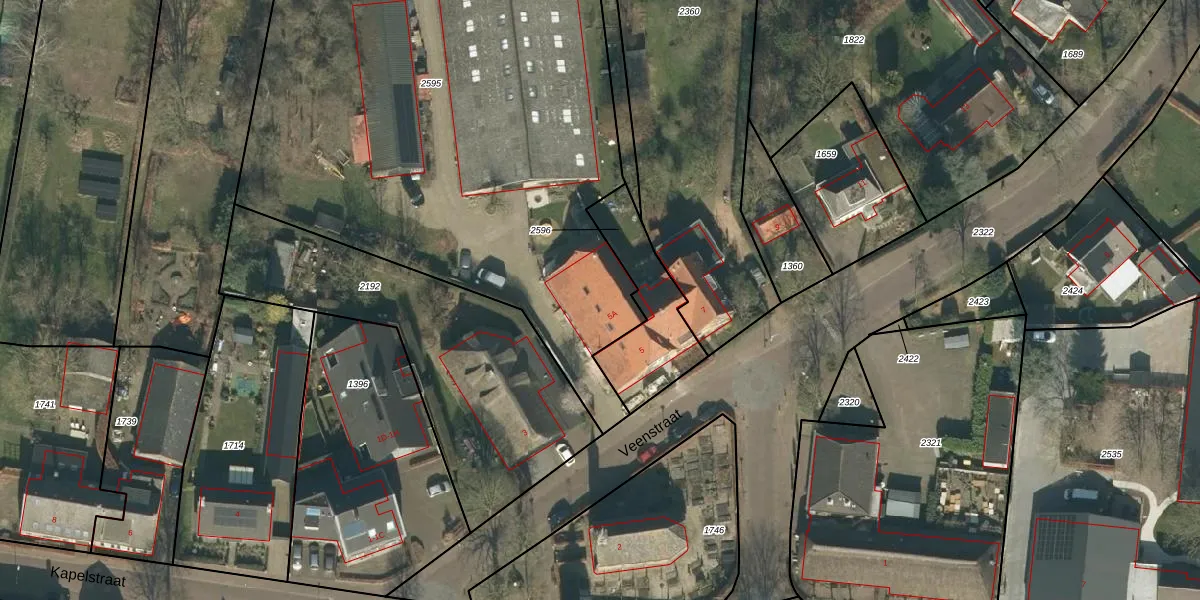 Het perceel waarop Veenstraat 5-A staat heeft een oppervlakte van 4489 m². Dit is een zeer groot perceel. De perceeloppervlakte wordt geregistreerd door het Kadaster. Gedetailleerde informatie over de maten van dit perceel kunt u vinden in het rapport Kadastrale kaart met maatvoering van Veenstraat 5-A.