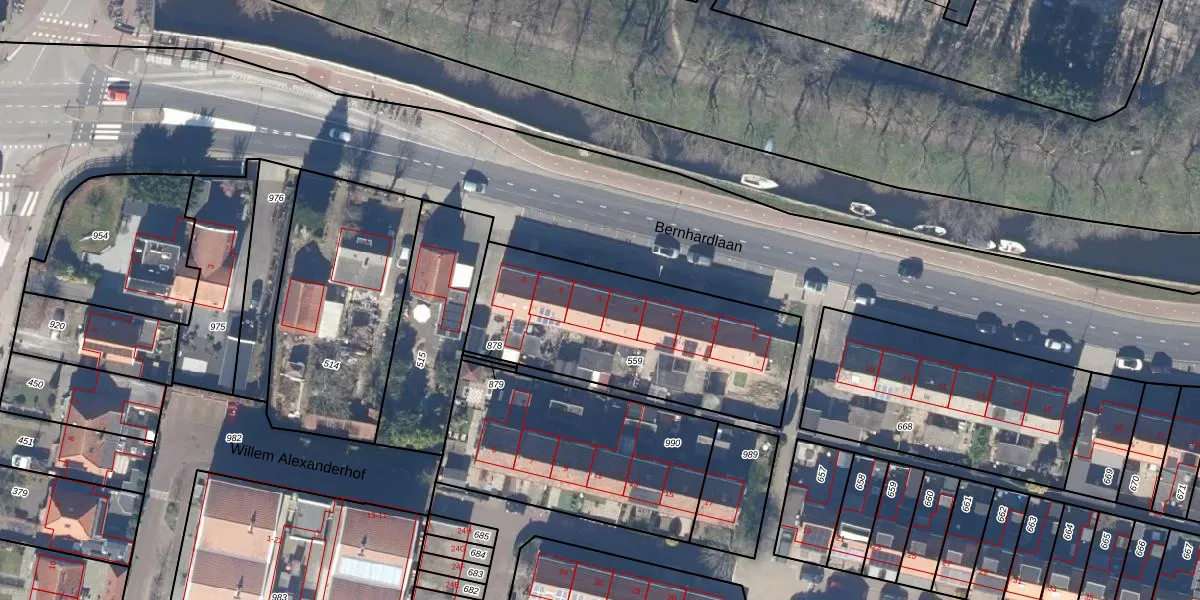 Het perceel waarop Bernhardlaan 5 staat heeft een oppervlakte van 1012 m². Dit is een zeer groot perceel. De perceeloppervlakte wordt geregistreerd door het Kadaster. Gedetailleerde informatie over de maten van dit perceel kunt u vinden in het rapport Kadastrale kaart met maatvoering van Bernhardlaan 5.