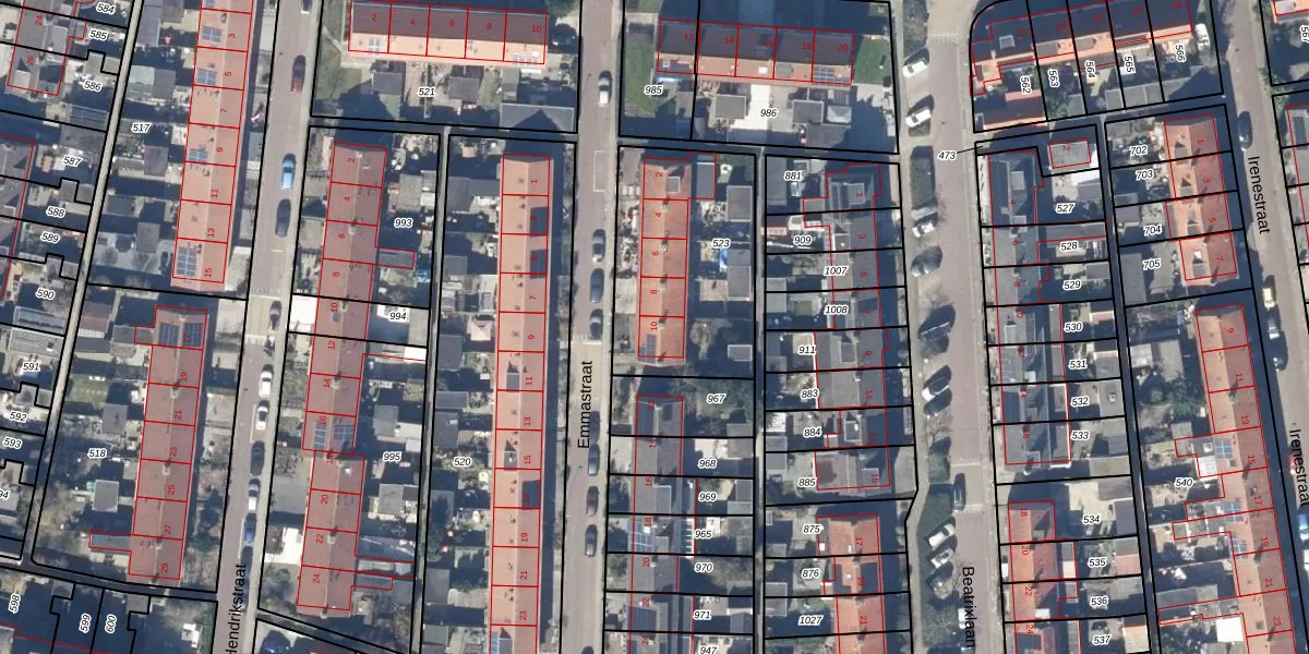 Het perceel waarop Emmastraat 10 staat heeft een oppervlakte van 733 m². Dit is een groot perceel. De perceeloppervlakte wordt geregistreerd door het Kadaster. Gedetailleerde informatie over de maten van dit perceel kunt u vinden in het rapport Kadastrale kaart met maatvoering van Emmastraat 10.