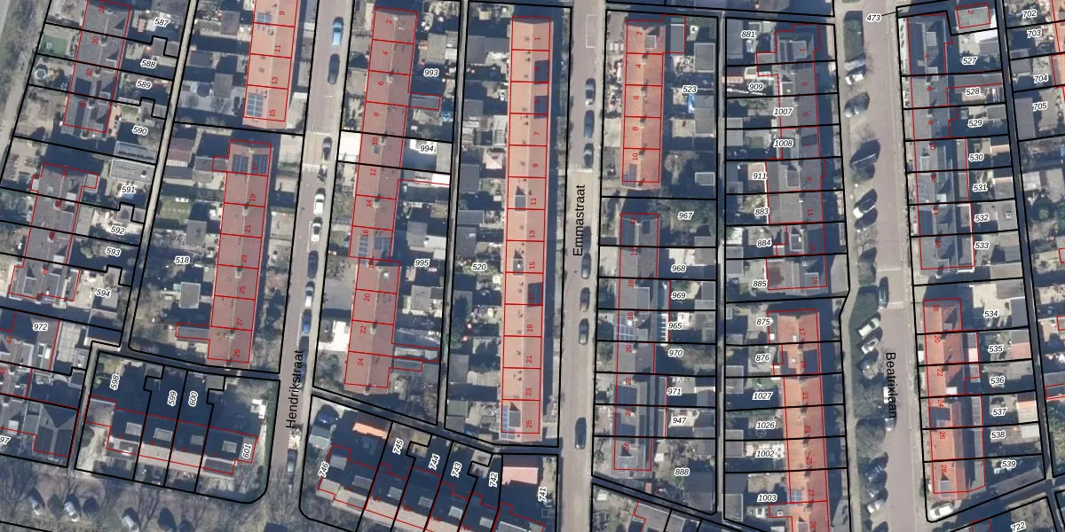 Het perceel waarop Emmastraat 15 staat heeft een oppervlakte van 1685 m². Dit is een zeer groot perceel. De perceeloppervlakte wordt geregistreerd door het Kadaster. Gedetailleerde informatie over de maten van dit perceel kunt u vinden in het rapport Kadastrale kaart met maatvoering van Emmastraat 15.