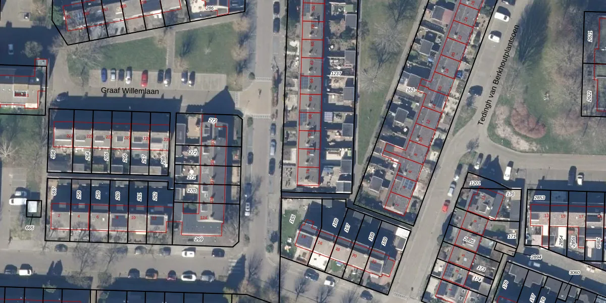 Het perceel waarop Graaf Willemlaan 72 staat heeft een oppervlakte van 1723 m². Dit is een zeer groot perceel. De perceeloppervlakte wordt geregistreerd door het Kadaster. Gedetailleerde informatie over de maten van dit perceel kunt u vinden in het rapport Kadastrale kaart met maatvoering van Graaf Willemlaan 72.