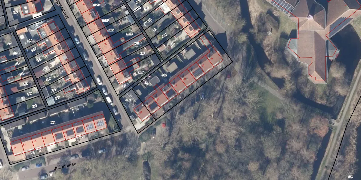 Het perceel waarop Julianalaan 67 staat heeft een oppervlakte van 1185 m². Dit is een zeer groot perceel. De perceeloppervlakte wordt geregistreerd door het Kadaster. Gedetailleerde informatie over de maten van dit perceel kunt u vinden in het rapport Kadastrale kaart met maatvoering van Julianalaan 67.