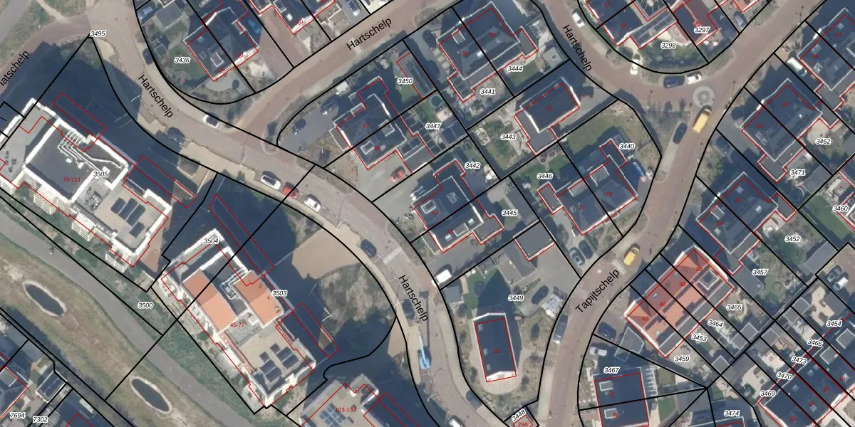 Het perceel waarop Hartschelp 41 staat heeft een oppervlakte van 345 m². Dit is een groot perceel. De perceeloppervlakte wordt geregistreerd door het Kadaster. Gedetailleerde informatie over de maten van dit perceel kunt u vinden in het rapport Kadastrale kaart met maatvoering van Hartschelp 41.