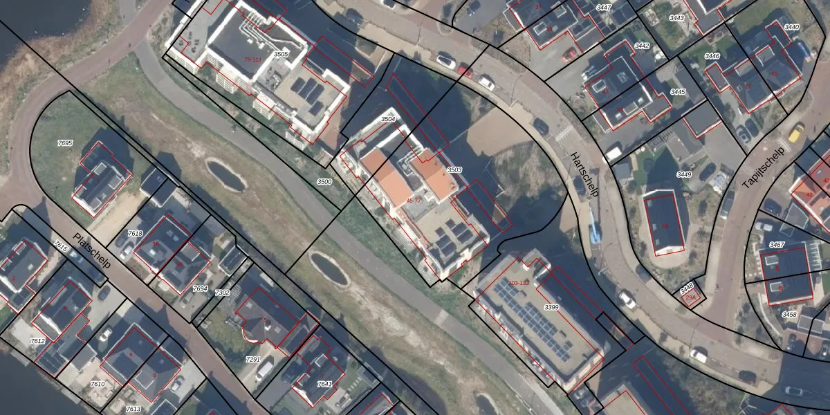 Het perceel waarop Hartschelp 65 staat heeft een oppervlakte van 1455 m². Dit is een zeer groot perceel. De perceeloppervlakte wordt geregistreerd door het Kadaster. Gedetailleerde informatie over de maten van dit perceel kunt u vinden in het rapport Kadastrale kaart met maatvoering van Hartschelp 65.