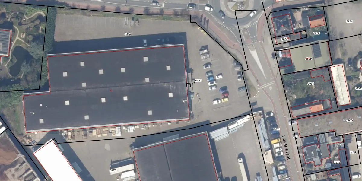 Het perceel waarop Havenstraat 41 staat heeft een oppervlakte van 7735 m². Dit is een zeer groot perceel. De perceeloppervlakte wordt geregistreerd door het Kadaster. Gedetailleerde informatie over de maten van dit perceel kunt u vinden in het rapport Kadastrale kaart met maatvoering van Havenstraat 41.