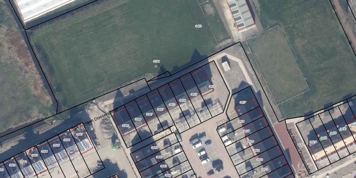 Jan Adriaen Doesendreef 12 is gelegen op kadastraal perceel MSR00I3414. Deze kadastrale aanduiding is uniek en wordt gebruikt door het Kadaster om eigendomsrechten en andere zakelijke rechten vast te leggen. Het perceel maakt onderdeel uit van de kadastrale gemeente Monster.