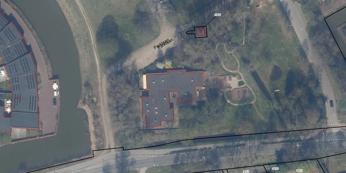 Het perceel waarop Parklaan 1 staat heeft een oppervlakte van 38,3 ha. Dit is een zeer groot perceel. De perceeloppervlakte wordt geregistreerd door het Kadaster. Gedetailleerde informatie over de maten van dit perceel kunt u vinden in het rapport Kadastrale kaart met maatvoering van Parklaan 1.