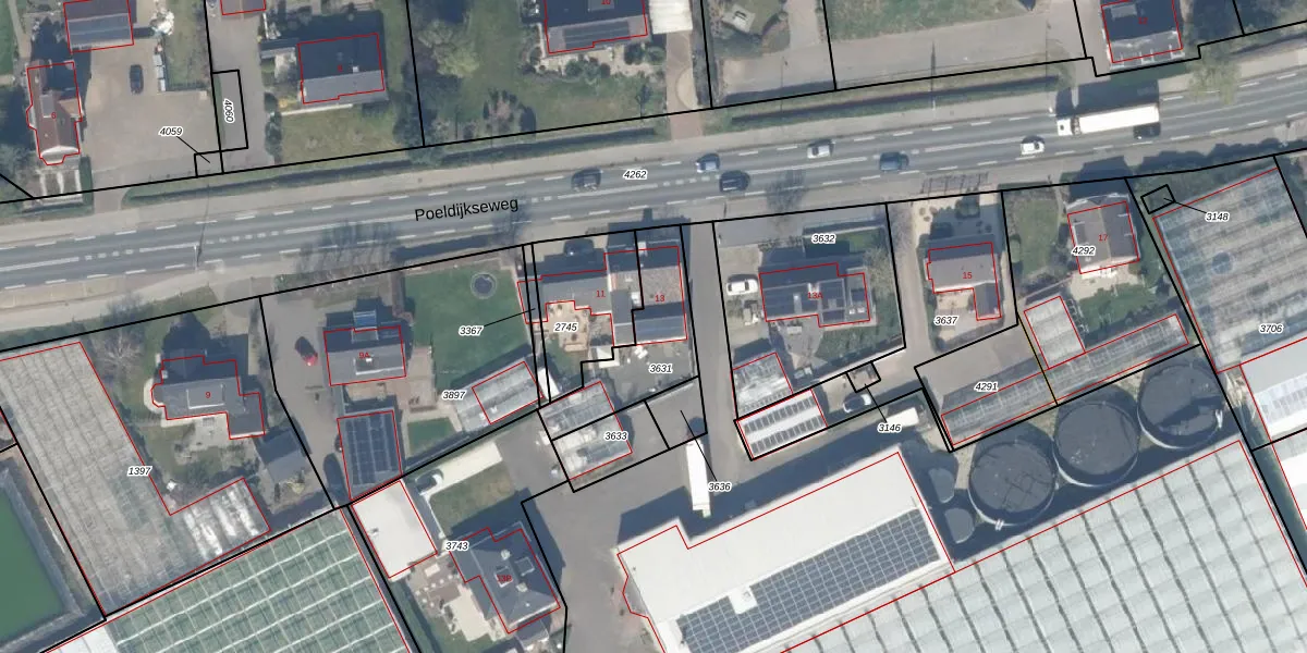 Poeldijkseweg 13 is gelegen op kadastraal perceel MSR00H3631. Deze kadastrale aanduiding is uniek en wordt gebruikt door het Kadaster om eigendomsrechten en andere zakelijke rechten vast te leggen. Het perceel maakt onderdeel uit van de kadastrale gemeente Monster.