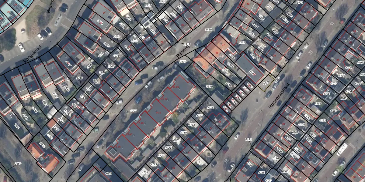 Het perceel waarop Rijnweg 25 staat heeft een oppervlakte van 1880 m². Dit is een zeer groot perceel. De perceeloppervlakte wordt geregistreerd door het Kadaster. Gedetailleerde informatie over de maten van dit perceel kunt u vinden in het rapport Kadastrale kaart met maatvoering van Rijnweg 25.