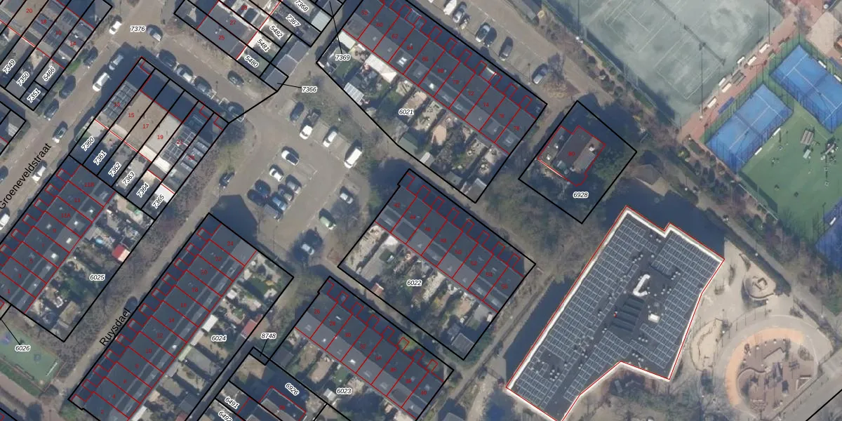 Het perceel waarop Ruysdael 44 staat heeft een oppervlakte van 1033 m². Dit is een zeer groot perceel. De perceeloppervlakte wordt geregistreerd door het Kadaster. Gedetailleerde informatie over de maten van dit perceel kunt u vinden in het rapport Kadastrale kaart met maatvoering van Ruysdael 44.