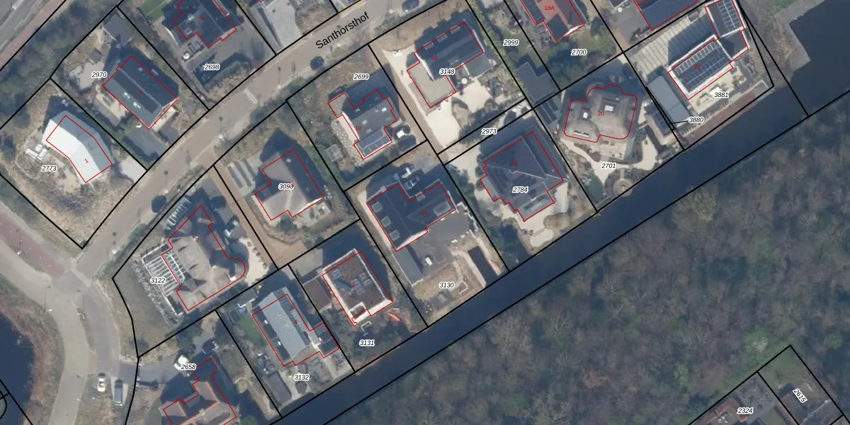 Het perceel waarop Santhorsthof 12 staat heeft een oppervlakte van 862 m². Dit is een groot perceel. De perceeloppervlakte wordt geregistreerd door het Kadaster. Gedetailleerde informatie over de maten van dit perceel kunt u vinden in het rapport Kadastrale kaart met maatvoering van Santhorsthof 12.