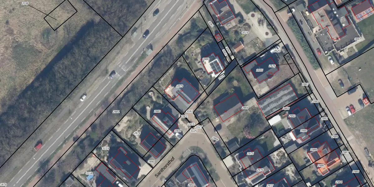 Het perceel waarop Santhorsthof 54 staat heeft een oppervlakte van 446 m². Dit is een groot perceel. De perceeloppervlakte wordt geregistreerd door het Kadaster. Gedetailleerde informatie over de maten van dit perceel kunt u vinden in het rapport Kadastrale kaart met maatvoering van Santhorsthof 54.