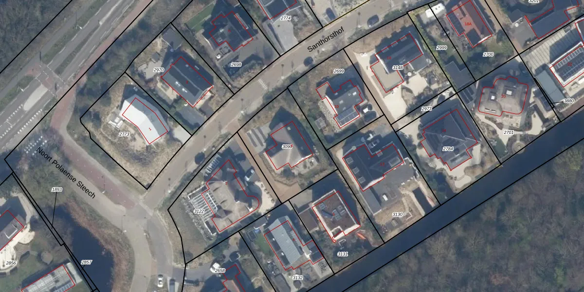 Het perceel waarop Santhorsthof 8 staat heeft een oppervlakte van 703 m². Dit is een groot perceel. De perceeloppervlakte wordt geregistreerd door het Kadaster. Gedetailleerde informatie over de maten van dit perceel kunt u vinden in het rapport Kadastrale kaart met maatvoering van Santhorsthof 8.