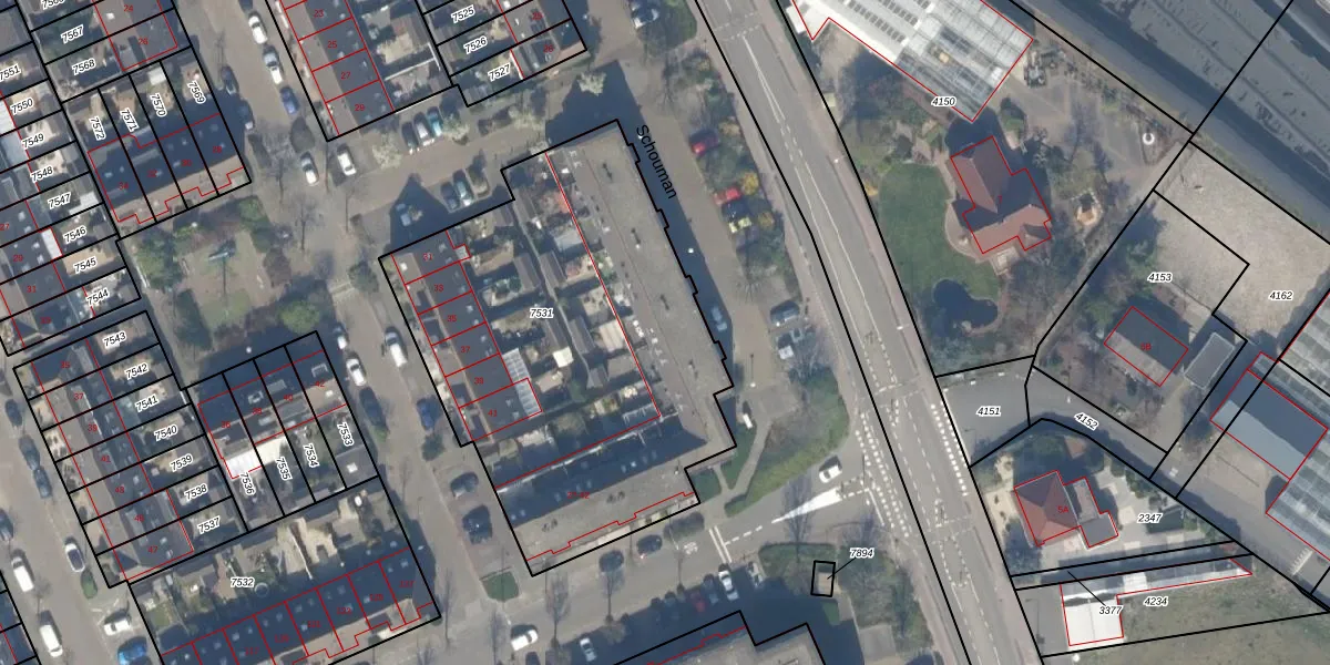 Het perceel waarop Schouman 38 staat heeft een oppervlakte van 2146 m². Dit is een zeer groot perceel. De perceeloppervlakte wordt geregistreerd door het Kadaster. Gedetailleerde informatie over de maten van dit perceel kunt u vinden in het rapport Kadastrale kaart met maatvoering van Schouman 38.