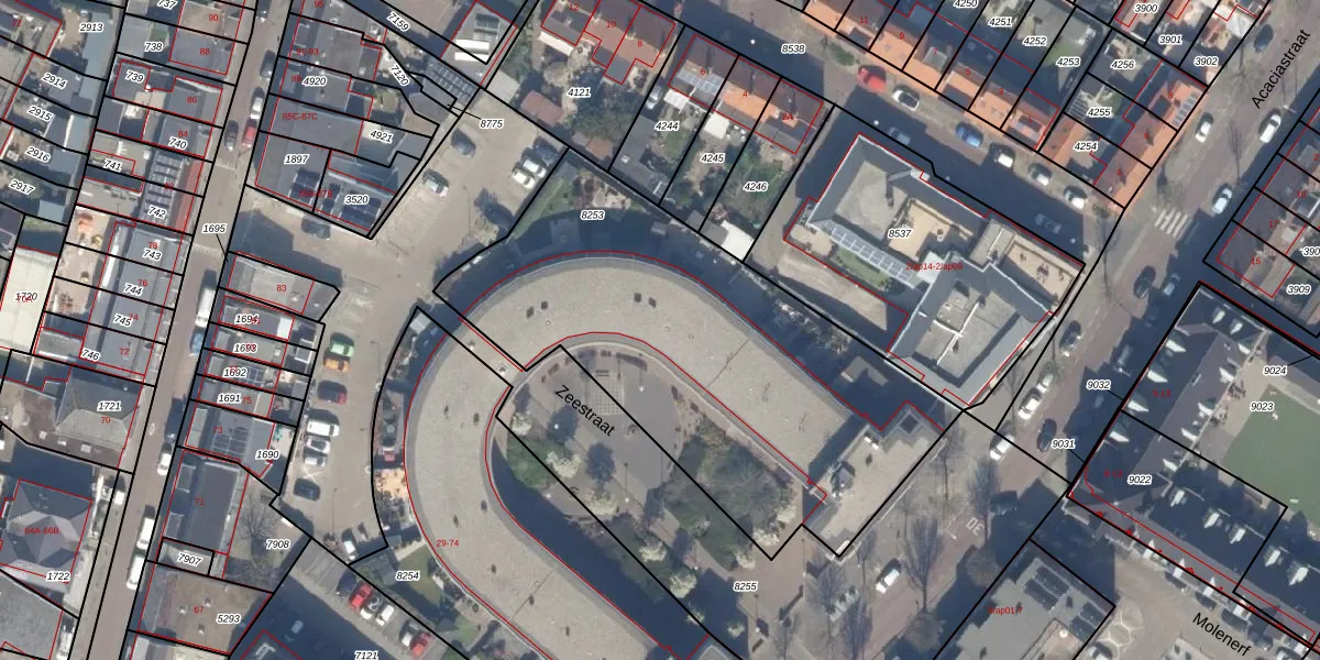 Het perceel waarop Zeestraat 43 staat heeft een oppervlakte van 2165 m². Dit is een zeer groot perceel. De perceeloppervlakte wordt geregistreerd door het Kadaster. Gedetailleerde informatie over de maten van dit perceel kunt u vinden in het rapport Kadastrale kaart met maatvoering van Zeestraat 43.