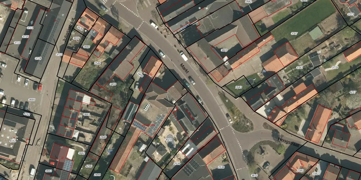 Het perceel waarop Markt 24-A staat heeft een oppervlakte van 2474 m². Dit is een zeer groot perceel. De perceeloppervlakte wordt geregistreerd door het Kadaster. Gedetailleerde informatie over de maten van dit perceel kunt u vinden in het rapport Kadastrale kaart met maatvoering van Markt 24-A.
