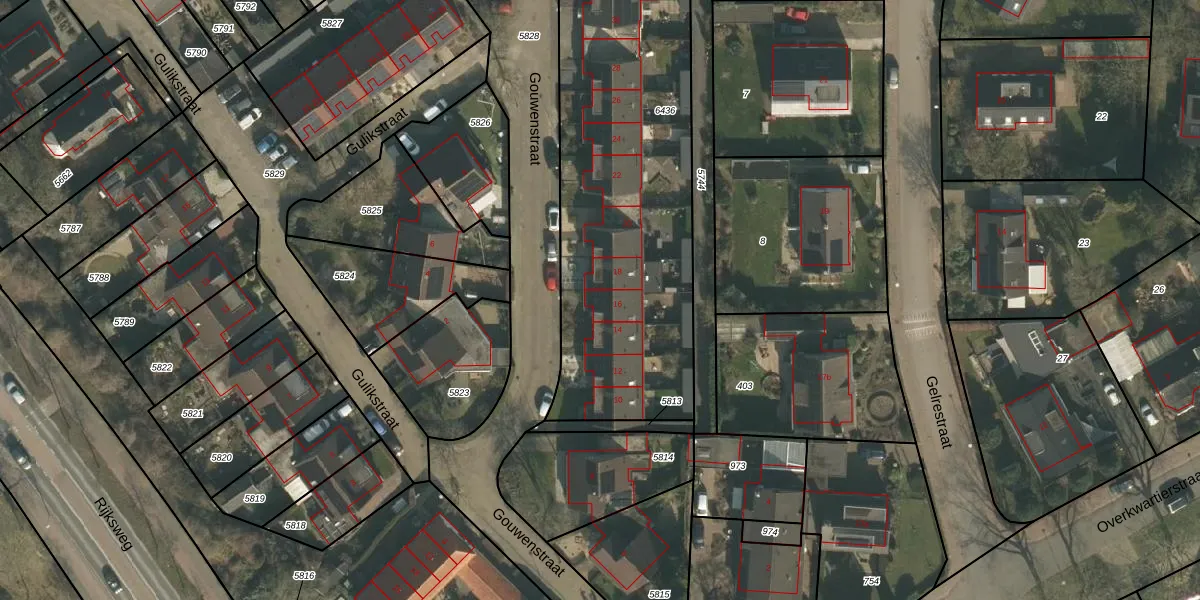 Gouwenstraat 16 is gelegen op kadastraal perceel MOO00A6436. Deze kadastrale aanduiding is uniek en wordt gebruikt door het Kadaster om eigendomsrechten en andere zakelijke rechten vast te leggen. Het perceel maakt onderdeel uit van de kadastrale gemeente Mook en Middelaar.