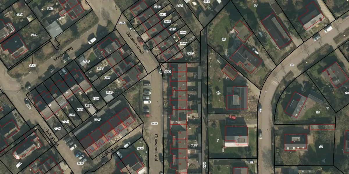 Gouwenstraat 36 is gelegen op kadastraal perceel MOO00A6436. Deze kadastrale aanduiding is uniek en wordt gebruikt door het Kadaster om eigendomsrechten en andere zakelijke rechten vast te leggen. Het perceel maakt onderdeel uit van de kadastrale gemeente Mook en Middelaar.