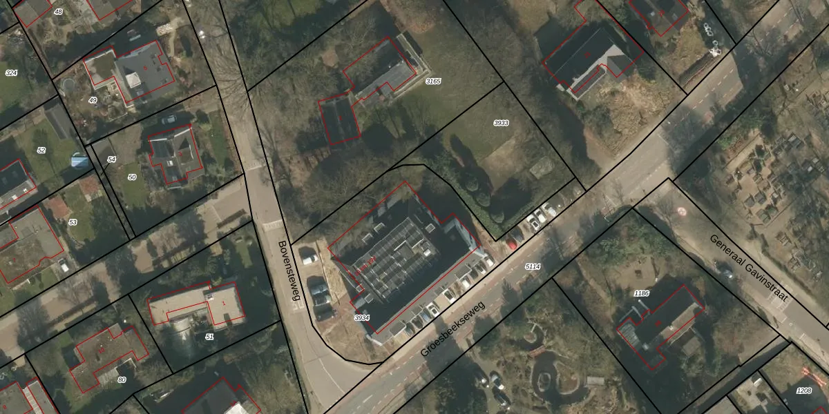 Het perceel waarop Groesbeekseweg 19-M staat heeft een oppervlakte van 1660 m². Dit is een zeer groot perceel. De perceeloppervlakte wordt geregistreerd door het Kadaster. Gedetailleerde informatie over de maten van dit perceel kunt u vinden in het rapport Kadastrale kaart met maatvoering van Groesbeekseweg 19-M.