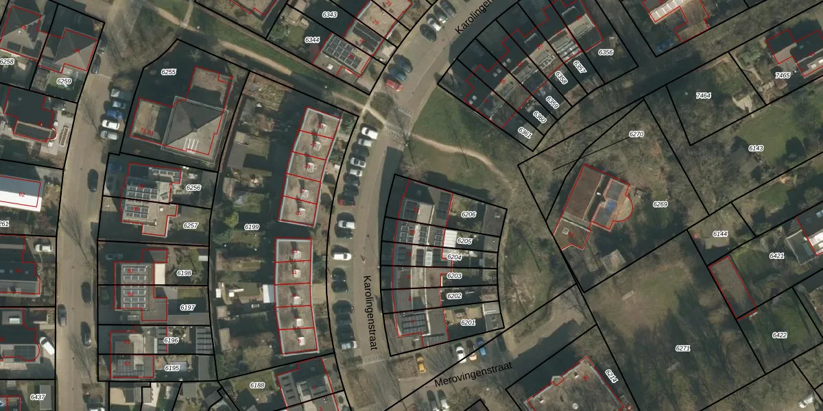 Karolingenstraat 12 is gelegen op kadastraal perceel MOO00A6206. Deze kadastrale aanduiding is uniek en wordt gebruikt door het Kadaster om eigendomsrechten en andere zakelijke rechten vast te leggen. Het perceel maakt onderdeel uit van de kadastrale gemeente Mook en Middelaar.