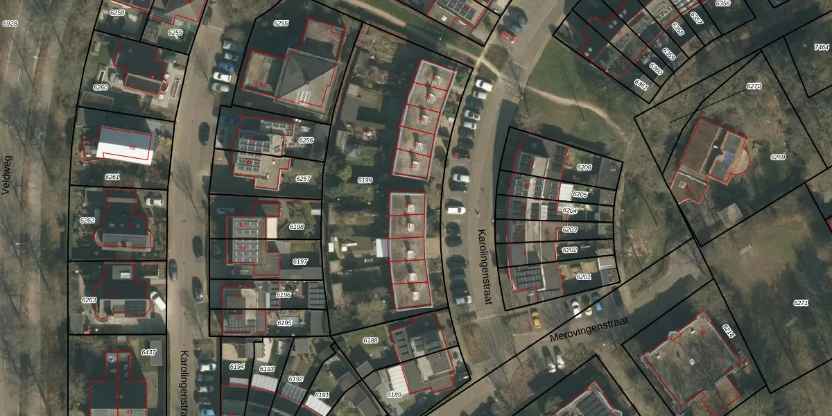 Karolingenstraat 13 is gelegen op kadastraal perceel MOO00A6199. Deze kadastrale aanduiding is uniek en wordt gebruikt door het Kadaster om eigendomsrechten en andere zakelijke rechten vast te leggen. Het perceel maakt onderdeel uit van de kadastrale gemeente Mook en Middelaar.