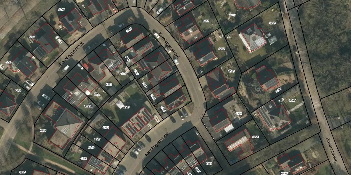 Karolingenstraat 41 is gelegen op kadastraal perceel MOO00A6349. Deze kadastrale aanduiding is uniek en wordt gebruikt door het Kadaster om eigendomsrechten en andere zakelijke rechten vast te leggen. Het perceel maakt onderdeel uit van de kadastrale gemeente Mook en Middelaar.