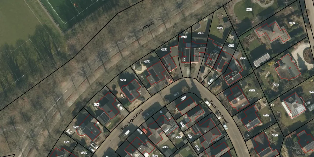 Het perceel waarop Karolingenstraat 44 staat heeft een oppervlakte van 426 m². Dit is een groot perceel. De perceeloppervlakte wordt geregistreerd door het Kadaster. Gedetailleerde informatie over de maten van dit perceel kunt u vinden in het rapport Kadastrale kaart met maatvoering van Karolingenstraat 44.