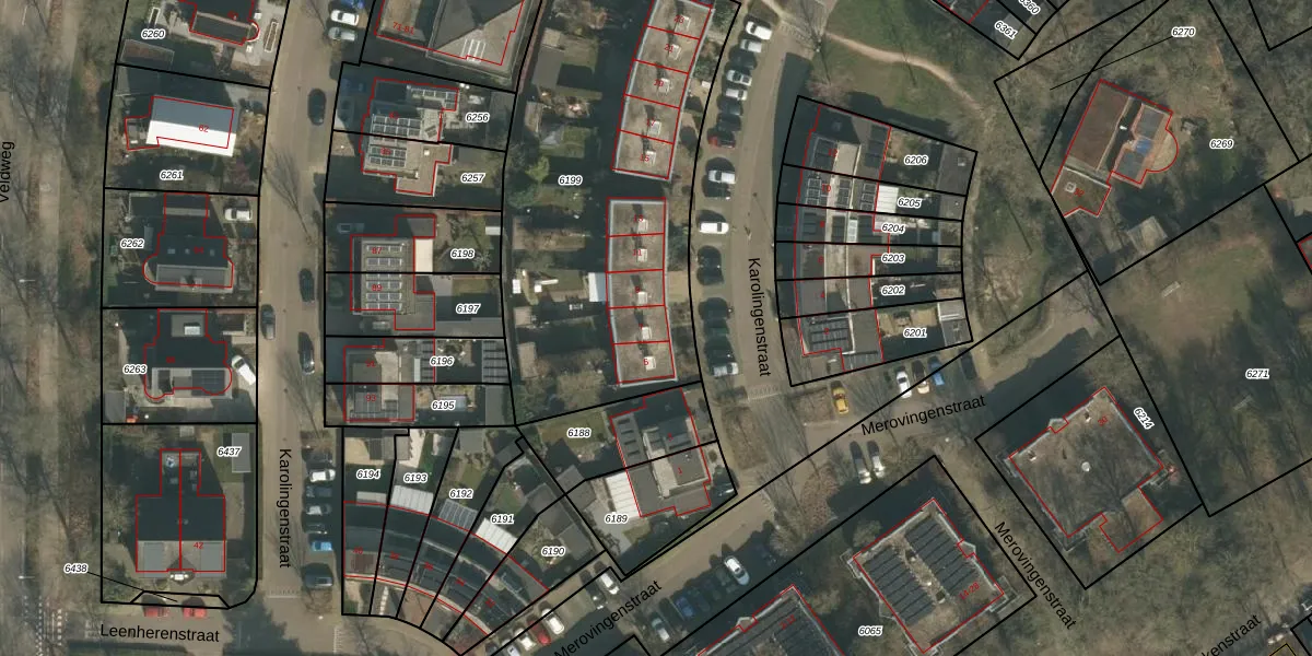 Het perceel waarop Karolingenstraat 7 staat heeft een oppervlakte van 1950 m². Dit is een zeer groot perceel. De perceeloppervlakte wordt geregistreerd door het Kadaster. Gedetailleerde informatie over de maten van dit perceel kunt u vinden in het rapport Kadastrale kaart met maatvoering van Karolingenstraat 7.