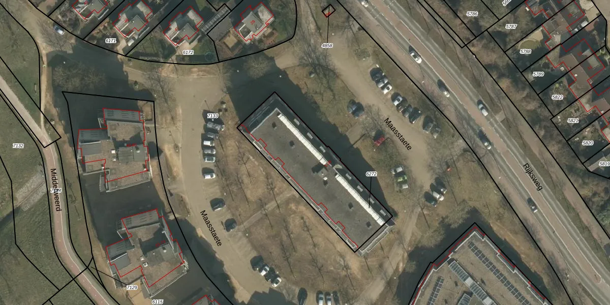 Het perceel waarop Maasstaete 14 staat heeft een oppervlakte van 967 m². Dit is een groot perceel. De perceeloppervlakte wordt geregistreerd door het Kadaster. Gedetailleerde informatie over de maten van dit perceel kunt u vinden in het rapport Kadastrale kaart met maatvoering van Maasstaete 14.