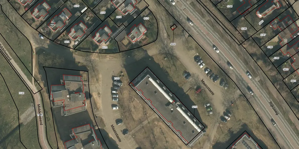 Het perceel waarop Maasstaete 4 staat heeft een oppervlakte van 967 m². Dit is een groot perceel. De perceeloppervlakte wordt geregistreerd door het Kadaster. Gedetailleerde informatie over de maten van dit perceel kunt u vinden in het rapport Kadastrale kaart met maatvoering van Maasstaete 4.