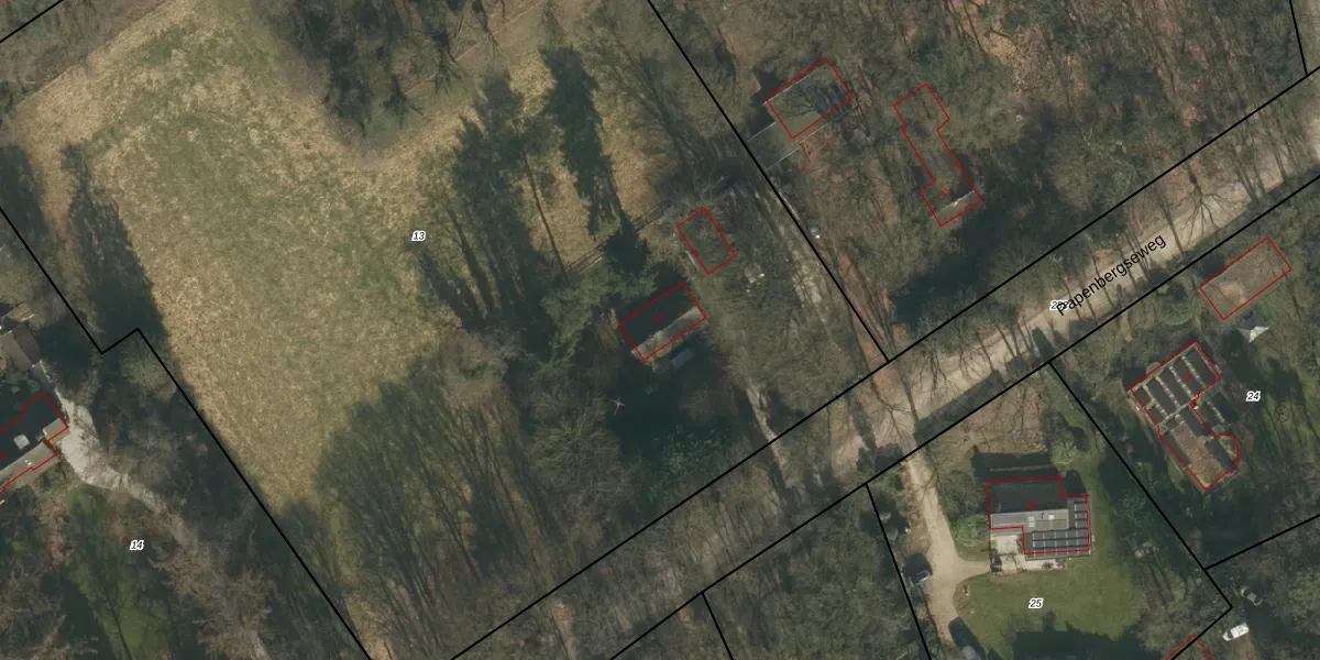 Papenbergseweg 13 is gelegen op kadastraal perceel MOO00E13. Deze kadastrale aanduiding is uniek en wordt gebruikt door het Kadaster om eigendomsrechten en andere zakelijke rechten vast te leggen. Het perceel maakt onderdeel uit van de kadastrale gemeente Mook en Middelaar.