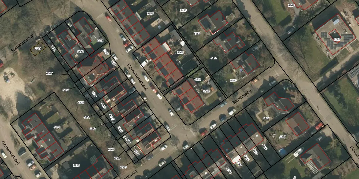 Het perceel waarop Romeinenstraat 6 staat heeft een oppervlakte van 590 m². Dit is een groot perceel. De perceeloppervlakte wordt geregistreerd door het Kadaster. Gedetailleerde informatie over de maten van dit perceel kunt u vinden in het rapport Kadastrale kaart met maatvoering van Romeinenstraat 6.