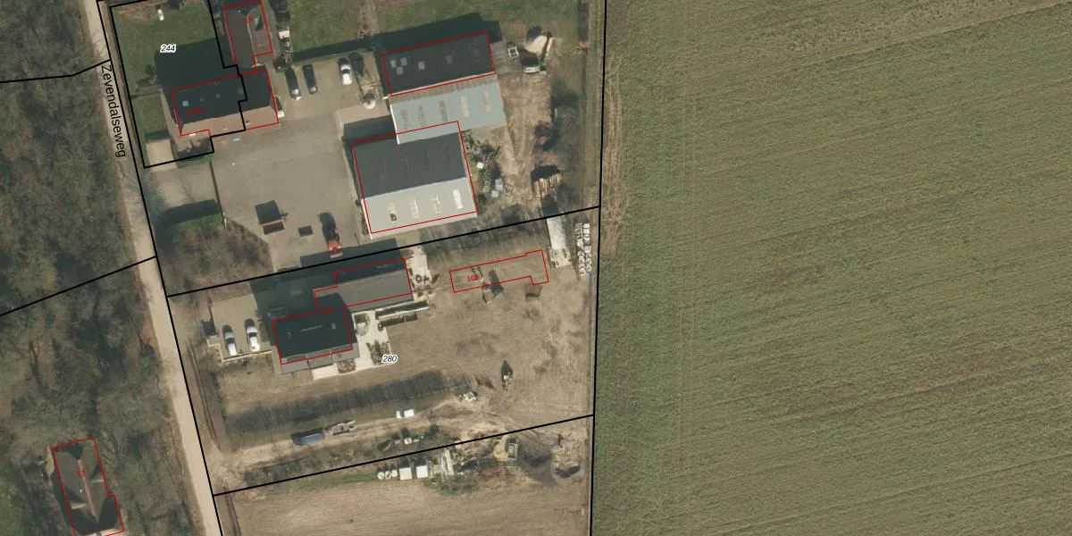 Zevendalseweg 16-b is gelegen op kadastraal perceel MOO00E280. Deze kadastrale aanduiding is uniek en wordt gebruikt door het Kadaster om eigendomsrechten en andere zakelijke rechten vast te leggen. Het perceel maakt onderdeel uit van de kadastrale gemeente Mook en Middelaar.