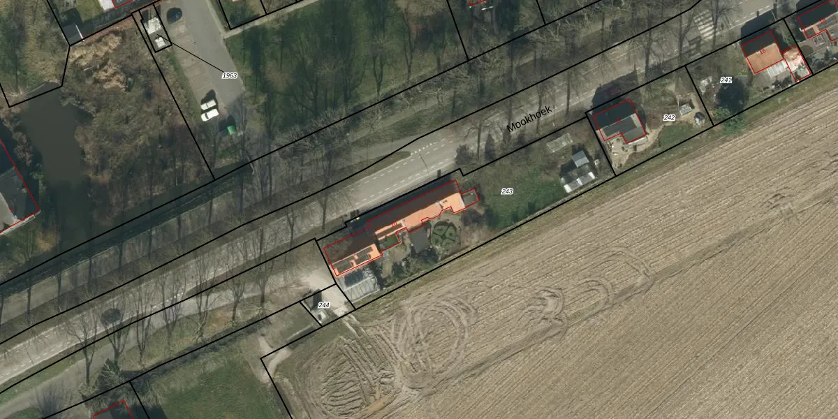 Het perceel waarop Mookhoek 10 staat heeft een oppervlakte van 1260 m². Dit is een zeer groot perceel. De perceeloppervlakte wordt geregistreerd door het Kadaster. Gedetailleerde informatie over de maten van dit perceel kunt u vinden in het rapport Kadastrale kaart met maatvoering van Mookhoek 10.