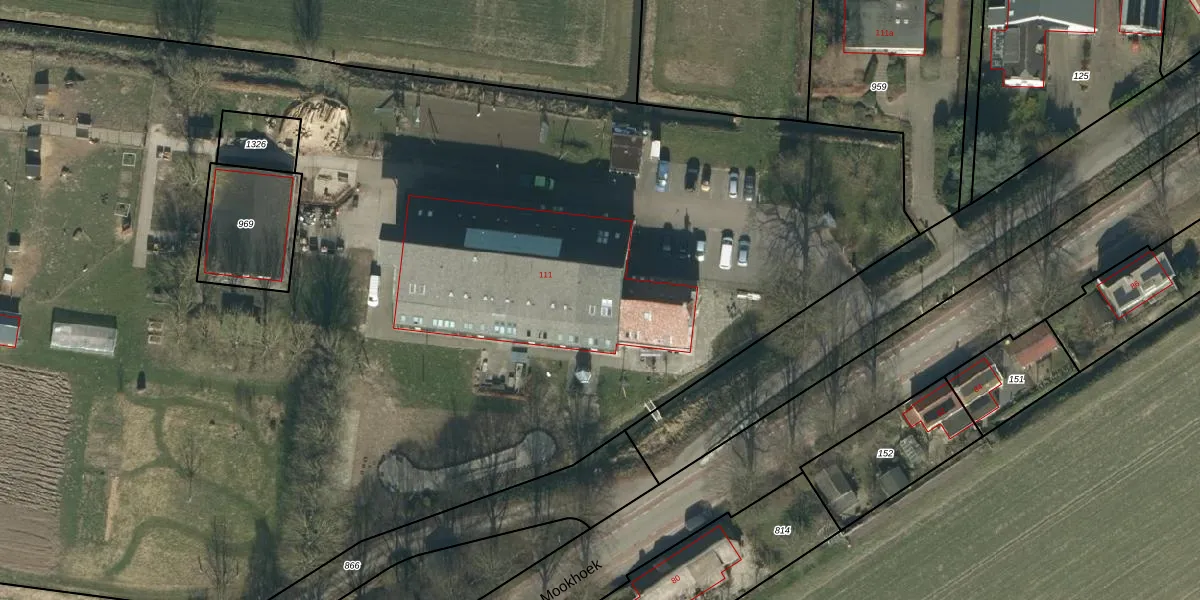 Het perceel waarop Mookhoek 111 staat heeft een oppervlakte van 1,6 ha. Dit is een zeer groot perceel. De perceeloppervlakte wordt geregistreerd door het Kadaster. Gedetailleerde informatie over de maten van dit perceel kunt u vinden in het rapport Kadastrale kaart met maatvoering van Mookhoek 111.