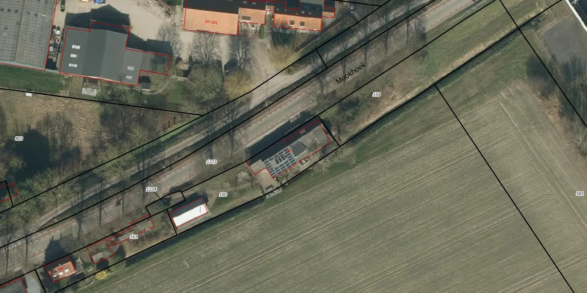 Het perceel waarop Mookhoek 68 staat heeft een oppervlakte van 785 m². Dit is een groot perceel. De perceeloppervlakte wordt geregistreerd door het Kadaster. Gedetailleerde informatie over de maten van dit perceel kunt u vinden in het rapport Kadastrale kaart met maatvoering van Mookhoek 68.