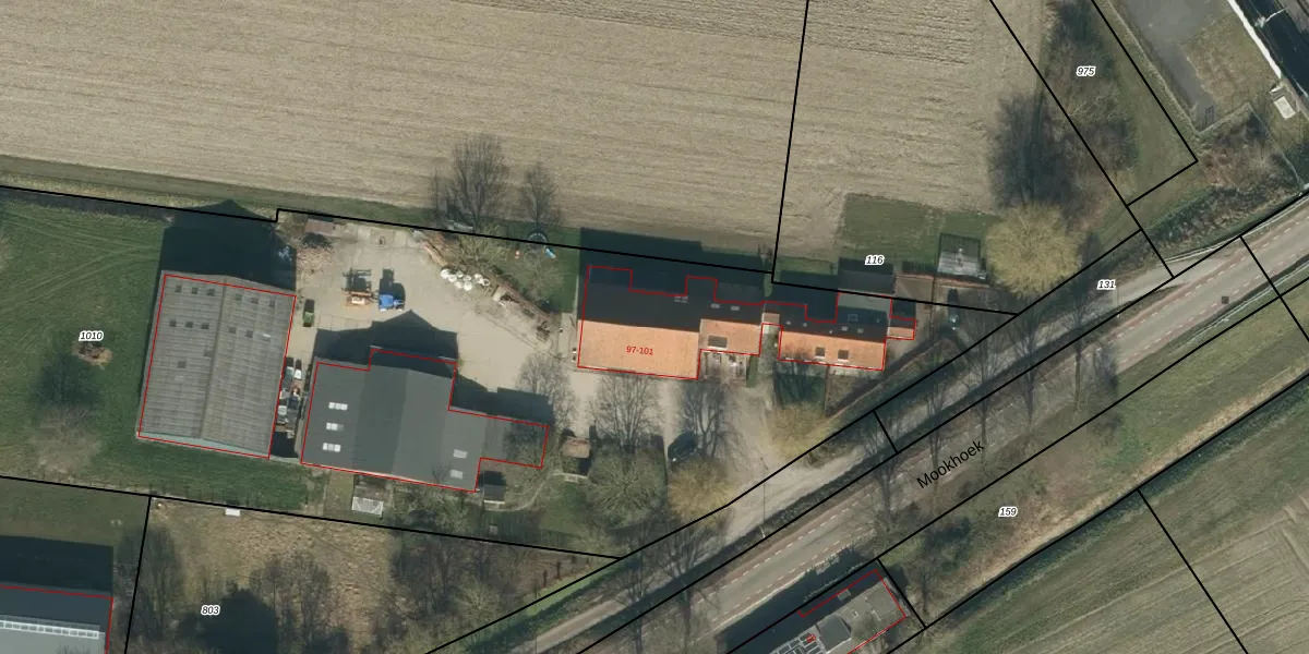 Het perceel waarop Mookhoek 97 staat heeft een oppervlakte van 1,0 ha. Dit is een zeer groot perceel. De perceeloppervlakte wordt geregistreerd door het Kadaster. Gedetailleerde informatie over de maten van dit perceel kunt u vinden in het rapport Kadastrale kaart met maatvoering van Mookhoek 97.