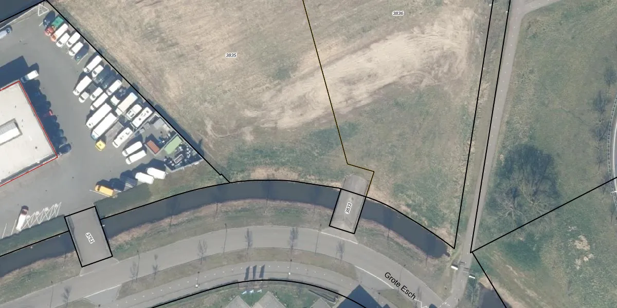 Het perceel waarop Grote Esch 19 staat heeft een oppervlakte van 5165 m². Dit is een zeer groot perceel. De perceeloppervlakte wordt geregistreerd door het Kadaster. Gedetailleerde informatie over de maten van dit perceel kunt u vinden in het rapport Kadastrale kaart met maatvoering van Grote Esch 19.